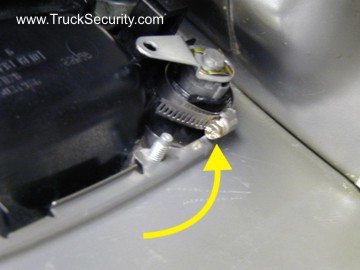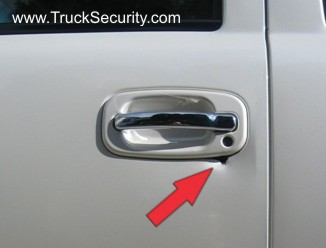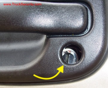 Both photos above are common methods of entry on these vehicles. The photo to the right shows how a Jimmi' Jammer® prevents this from happening. >> This photo shows the backside of a door handle, inside the door with the Jimmi' Jammer® installed. Notice how the lock area is protected with the plate forming around the lock holder. This prevents prying from under the handle as well as punching the lock into the door.