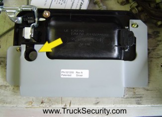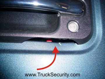 Here, the red arrow points to the Jimmi' Jammer® plate that would normally be hidden behind the door metal.