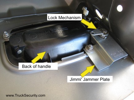 The Jimmi' Jammer® is a solid steel, custom formed steel plate that bolts directly to the back of your door handle. (Photo to the right shows an example.) >>